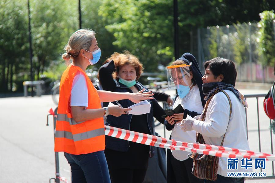 5月9日,在瑞士日内瓦一座体育馆外,一名志愿者与排队等候领取救助物资的人们交谈。 为了帮助新冠疫情期间失去收入又无法及时获得政府救助的人,一些公益组织每周六在瑞士日内瓦一座体育馆发放市民捐赠的救济品,还在现场提供免费新冠病毒检测、法律咨询等服务。 新华社记者 聂晓阳 摄