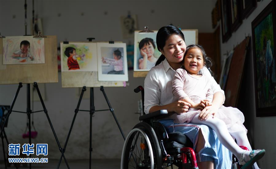 张海晶和女儿在自己的画室合影(5月7日摄)。 从女儿出生之日至今,每隔一段时间,张海晶就会为女儿画上一幅画,记录下她成长过程中的点点滴滴。 张海晶学画画是“半路出家”的。今年30岁的张海晶从小在浙江丽水长大,2008年,她在阳台收衣服时不幸从六楼跌落,虽然生命得以挽救,她却从此失去了行走的能力,只能与轮椅为伴。 突如其来的打击让张海晶情绪低沉了一年多。2009年,一次偶然的机会,张海晶接触到绘画并为之着迷。她每天都坐着轮椅去学画画,也认识了许多志同道合的朋友。在他们的鼓励下,张海晶逐渐从痛苦中走了出来。 “那时候我真的迷上了画画,有些无法用言语述说的伤痛,却可以在安静的绘画过程中得以平复。”张海晶说。 2014年,张海晶在浙江绍兴认识了但誉超。但誉超也是一名残疾人,从小没有了右手。或许是有着相似的经历,两人有着很多共同语言,很快便坠入爱河。次年,张海晶跟随但誉超回到了位于江西省都昌县大港镇的老家,成为一名“外来媳妇”。 由于夫妇二人身体残疾加上家中老人身体孱弱,2016年,夫妇二人被当地识别为建档立卡贫困户。为了改善生活,张海晶利用绘画特长,出售自己的作品以增加家庭收入。在当地政府的帮扶下,张海晶在镇上创办了美术工作室,在指导当地的留守儿童学习绘画的同时,创作绘画作品在网上销售。丈夫但誉超在政府帮扶下也有了自己的工作。2018年,张海晶一家脱贫摘帽。 “我希望利用我的专长,普及农村美术教育,让更多的农村孩子学到一些绘画知识,为他们打开一扇绘画世界的大门,让他们的生活多一种可能。”张海晶说。 新华社记者 胡晨欢 摄