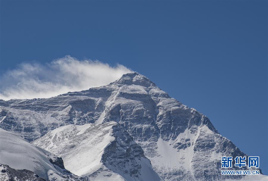 11时47分,珠峰峰顶出现旗云(4月16日摄)。新华社记者 孙非 摄