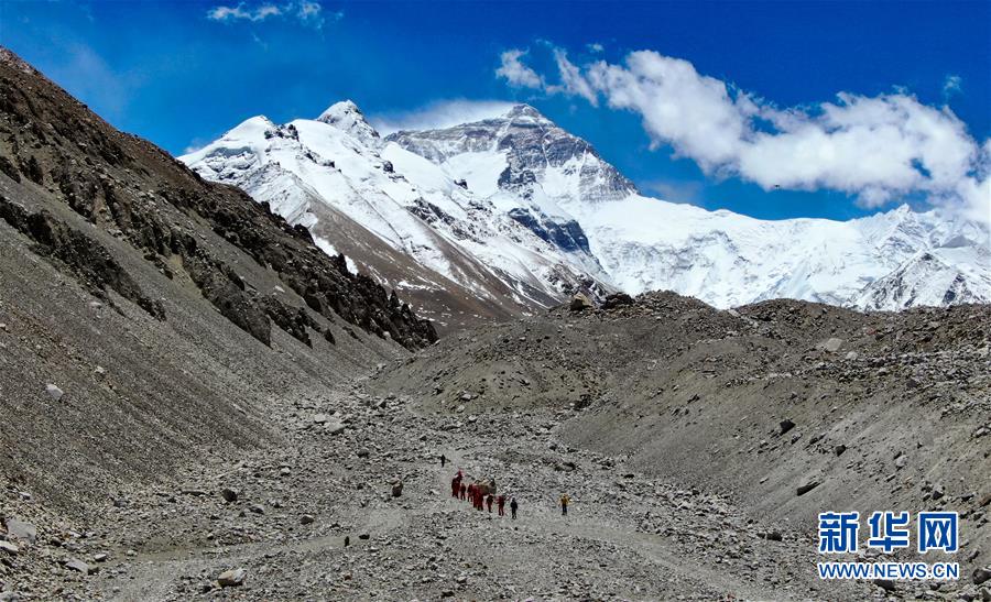 13时50分,2020珠峰高程测量登山队出发前往更高海拔营地(5月6日无人机拍摄)。新华社记者 晋美多吉 摄