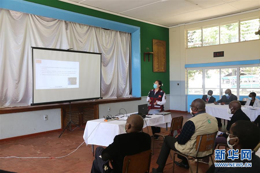 5月19日,在津巴布韦中马绍纳兰省的姆武尔维,专家组成员彭玥(前)与当地医护人员分享抗疫经验。 中国赴津巴布韦抗疫医疗专家组18日至20日分别前往津东马绍纳兰省、中马绍纳兰省和西马绍纳兰省交流考察,与当地医护人员分享抗疫经验,为当地医疗机构提供防疫建议并捐赠医疗物资。 新华社记者 张玉亮 摄