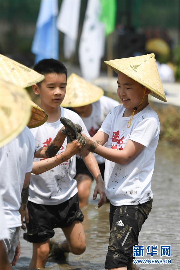 5月24日,小朋友在稻田里捉鱼,体验农事。 当日,十余名小朋友在家长的带领下来到浙江省湖州市吴兴区八里店镇尹家圩粮油植保农机专业合作社的稻田中,参加亲子插秧、稻田捉鱼等农事体验活动。 新华社记者 黄宗治 摄