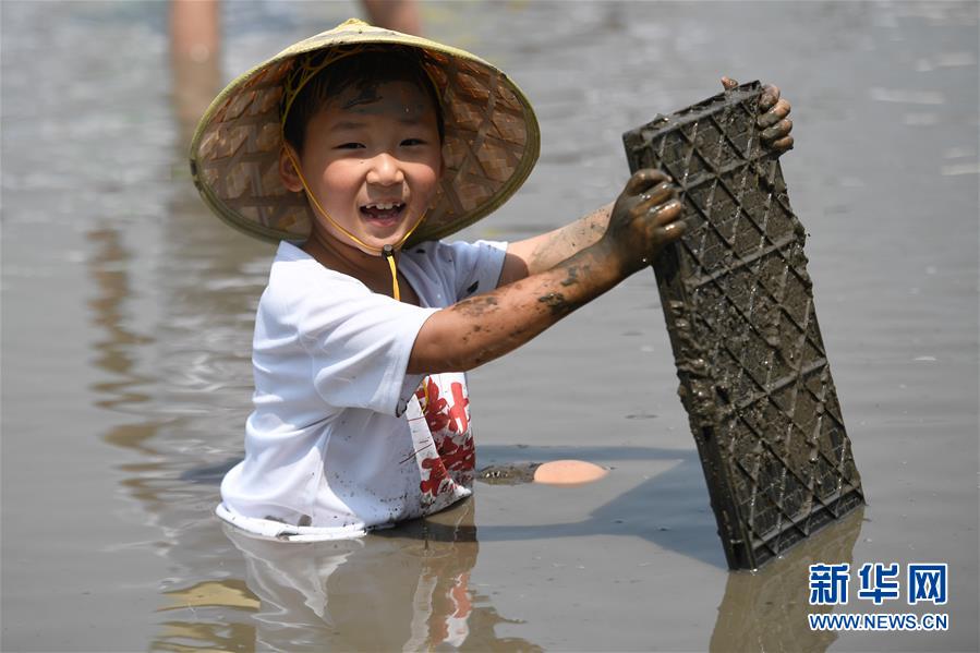 5月24日,一名小朋友在稻田里体验农事。 当日,十余名小朋友在家长的带领下来到浙江省湖州市吴兴区八里店镇尹家圩粮油植保农机专业合作社的稻田中,参加亲子插秧、稻田捉鱼等农事体验活动。 新华社记者 黄宗治 摄