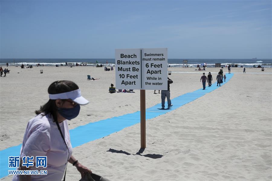 5月22日,在美国纽约州琼斯海滩,人们在沙滩上休闲,沙滩上竖立着保持社交距离的提示牌。 当天,美国纽约州属海滩在阵亡将士纪念日假期到来之际开始对公众开放。开放期间,海滩采取限制客流、保持社交距离、增加消毒等多项措施,防止新冠病毒传播。 新华社记者 王迎 摄