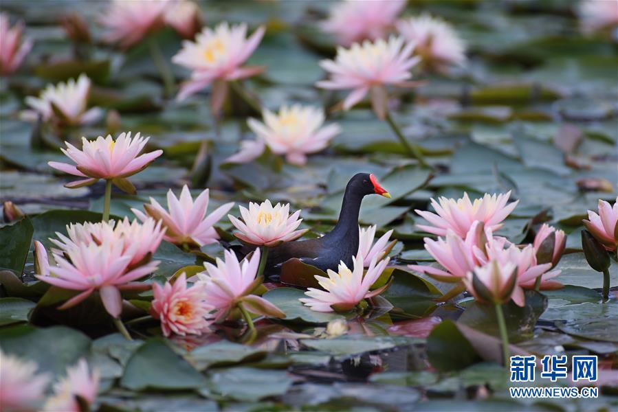 5月22日,一只红嘴水鸡在莲叶间游弋。 近日,贵阳市观山湖公园内大片盛开的莲花吸引了不少水鸟在其间嬉戏觅食。 新华社记者 刘续 摄