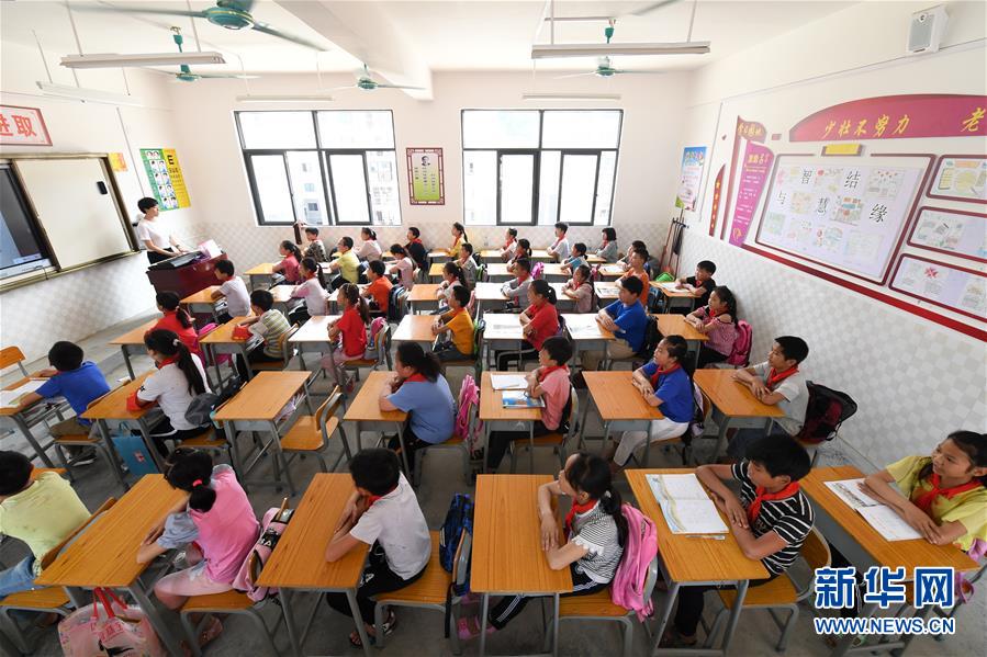 广西融水苗族自治县东阳村小学一年级学生在跟随老师拼读汉语拼音(2019年5月6日摄)。 新华社记者 张爱林 摄