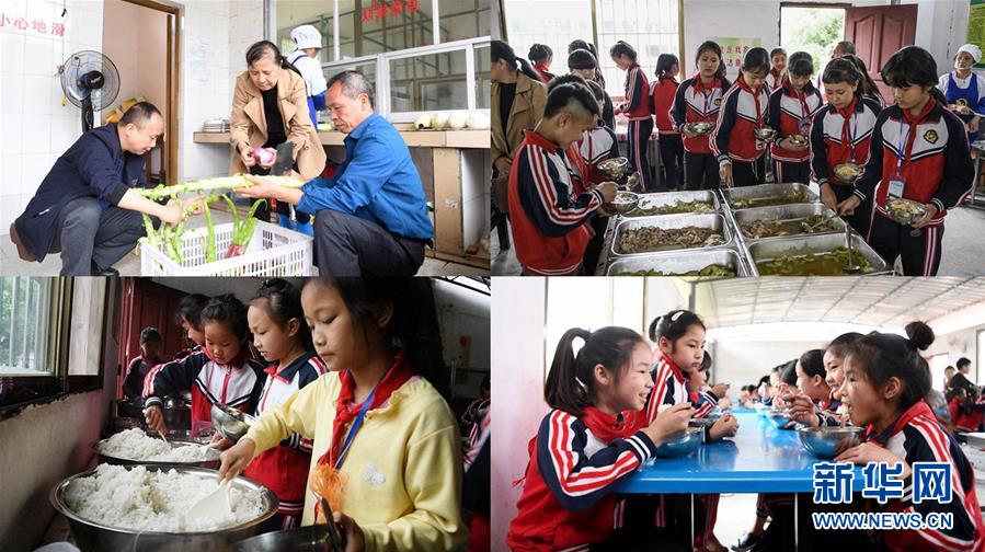 拼版照片:上左图为在广西融水苗族自治县东阳村小学,厨房师傅们在准备午餐;上右图、下左图为广西融水苗族自治县东阳村小学学生在排队打饭;下右图为广西融水苗族自治县东阳村小学学生在吃午饭(2019年5月6日摄)。 新华社记者 张爱林 摄