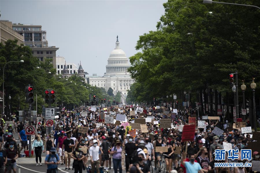 6月6日,人们在美国华盛顿国会附近游行。美国首都迎来了十几天来参与人数最多的游行活动。 当地时间6日,乔治·弗洛伊德之死引发的集会和示威继续在全美多个城市举行。尽管弗洛伊德已离世近两周,多地抗议规模依然庞大。 新华社记者 刘杰 摄 |