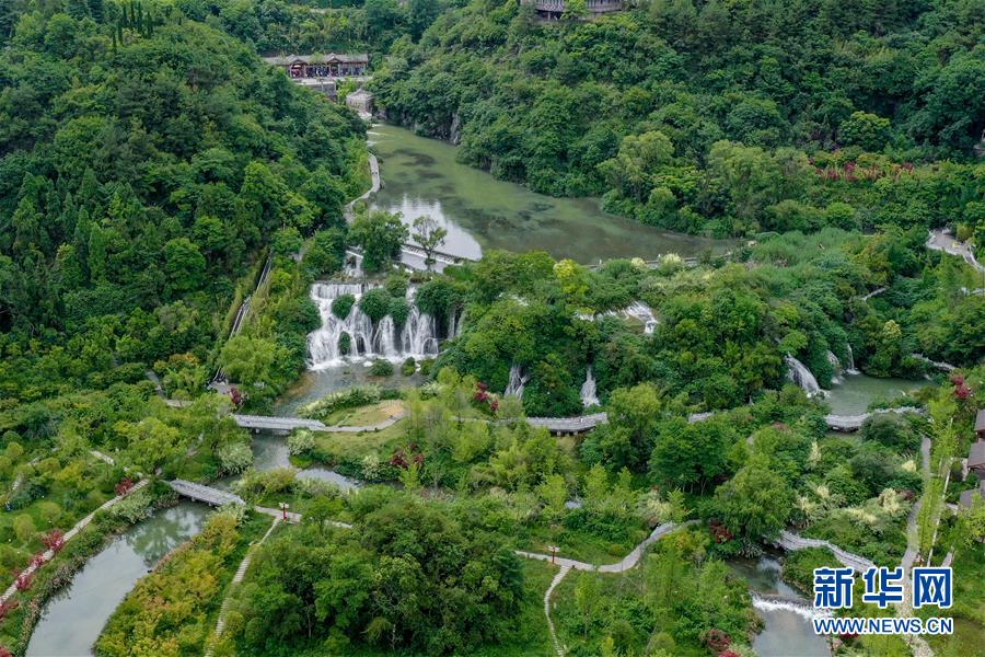 6月9日拍摄的贵阳市天河潭旅游度假区(无人机照片)。 夏日的贵阳市天河潭旅游度假区草木苍翠,风景如画,吸引游客来此休闲游玩。 新华社记者 欧东衢 摄