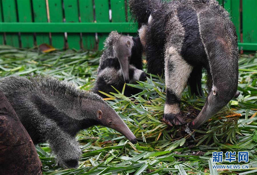 6月10日,广州长隆大食蚁兽妈妈(右)在舔食蚂蚁,龙凤胎幼崽围着它玩耍。 当日,广州长隆野生动物世界大食蚁兽龙凤胎与游客见面。这对大食蚁兽龙凤胎于2020年3月3日出生,大食蚁兽怀孕一般是单胎,出生体重约为1200克至1500克之间,但这对双胎的大食蚁兽出生体重都只有900克左右。大食蚁兽主要栖息地在美洲,已经被列入《世界自然保护联盟》濒危物种红色名录。 新华社记者 刘大伟摄