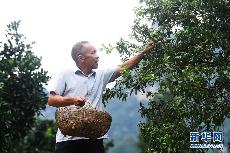7月3日,下庄村党支部书记毛相林在采摘脆李。当年他曾带领村民修出一条“通天路”。 新华社记者 王全超 摄