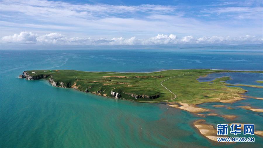 7月10日拍摄的青海湖风光(无人机照片)。 盛夏时节,被誉为“中国最美湖泊”的青海湖畔景色宜人,蓝天、白云、湖水与草原组成一幅壮美的画卷。 新华社记者 张宏祥 摄