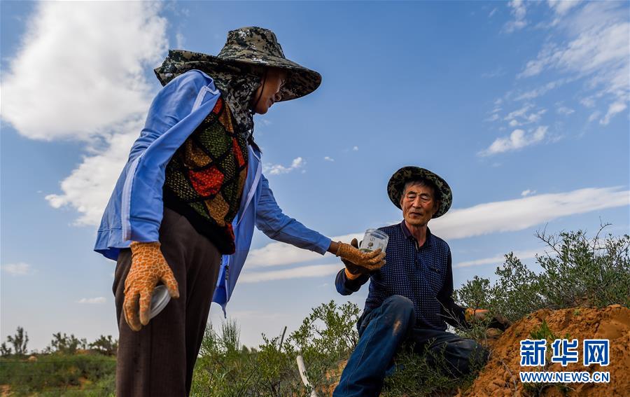 7月7日,孟和巴依尔(右)和老伴胡娜仁在种锁阳籽。 1993年,孟和巴依尔看到家乡内蒙古阿拉善盟阿拉善左旗超格图呼热苏木由于过度放牧,草场严重退化,于是,他与家人在家乡承包了4000多亩草场进行治沙造林。27年过去,孟和巴依尔一家承包的草场已从曾经生态脆弱的沙化土地变成了如今的茵茵绿洲。 7月间,在孟和巴依尔家位于腾格里沙漠边缘的草场上,梭梭、白刺、柠条、花棒等沙生植物随处可见,生机盎然。通过不断尝试,他还摆脱了传统养畜放牧的经营模式,探索出一条沙漠增绿、牧民增收的生态致富路,依靠梭梭、白刺成功嫁接苁蓉、锁阳,发展起了特色生态产业,目前年收入可达四五十万元。 如今,在孟和巴依尔一家的带动下,周边牧民也都纷纷参与到治沙绿化中来,将治沙又致富的接力棒不断传递开来。 新华社记者 连振 摄 |