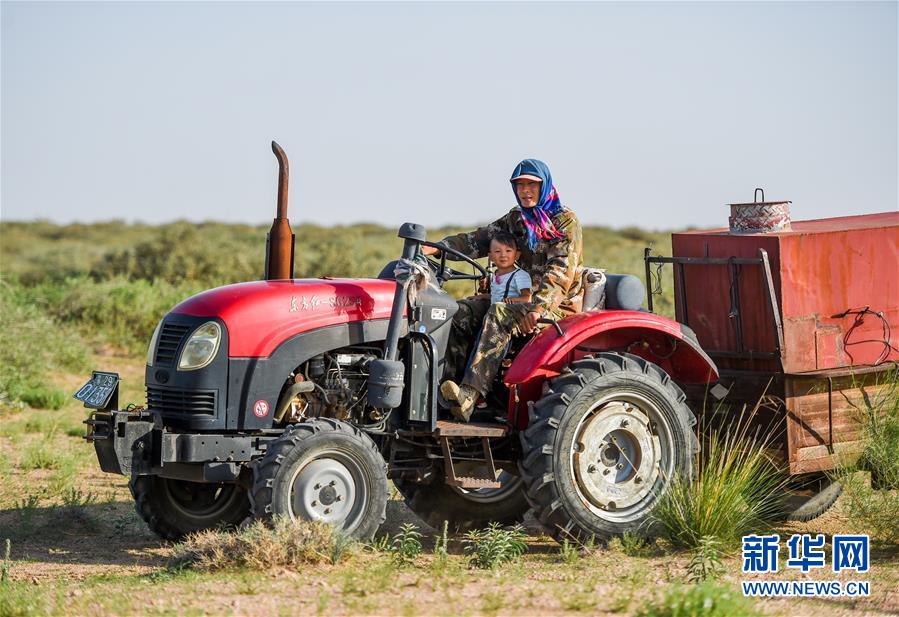 7月7日,孟和巴依尔和老伴胡娜仁骑着电动三轮车,拉着水去种植锁阳。 新华社记者 连振 摄