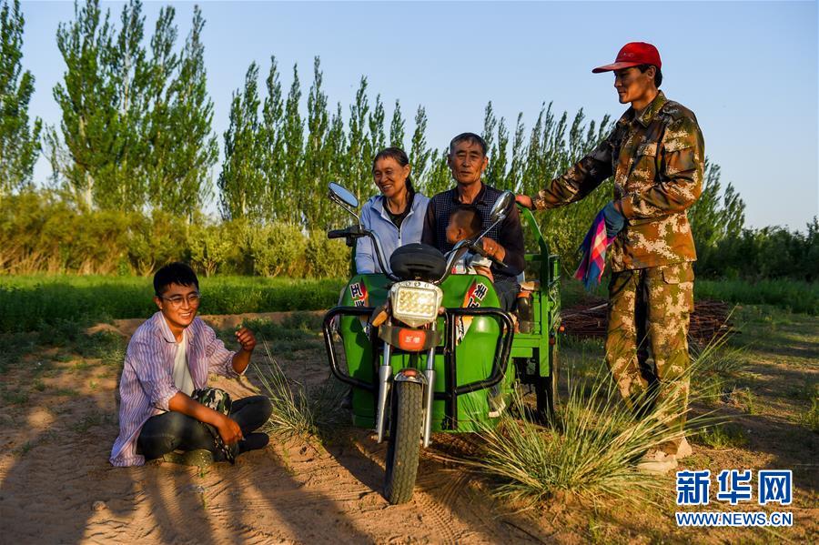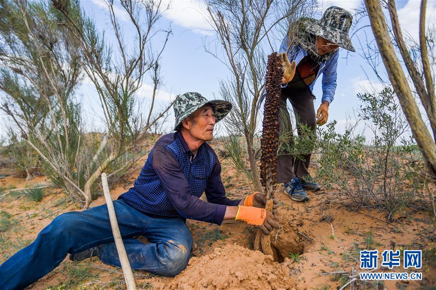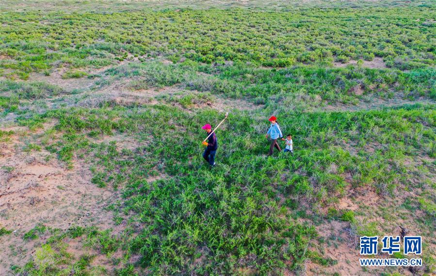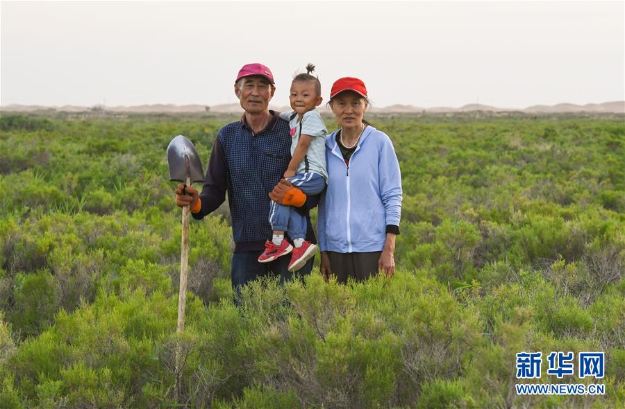 7月7日,孟和巴依尔(右)和老伴胡娜仁在种锁阳籽。 1993年,孟和巴依尔看到家乡内蒙古阿拉善盟阿拉善左旗超格图呼热苏木由于过度放牧,草场严重退化,于是,他与家人在家乡承包了4000多亩草场进行治沙造林。27年过去,孟和巴依尔一家承包的草场已从曾经生态脆弱的沙化土地变成了如今的茵茵绿洲。 7月间,在孟和巴依尔家位于腾格里沙漠边缘的草场上,梭梭、白刺、柠条、花棒等沙生植物随处可见,生机盎然。通过不断尝试,他还摆脱了传统养畜放牧的经营模式,探索出一条沙漠增绿、牧民增收的生态致富路,依靠梭梭、白刺成功嫁接苁蓉、锁阳,发展起了特色生态产业,目前年收入可达四五十万元。 如今,在孟和巴依尔一家的带动下,周边牧民也都纷纷参与到治沙绿化中来,将治沙又致富的接力棒不断传递开来。 新华社记者 连振 摄
