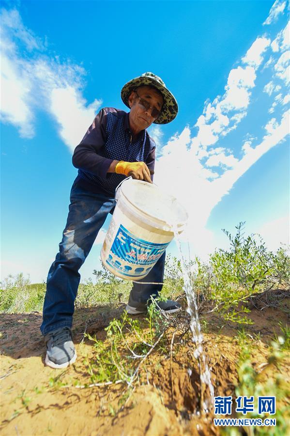 7月7日,孟和巴依尔为刚种下的锁阳籽浇水。 新华社记者 彭源 摄