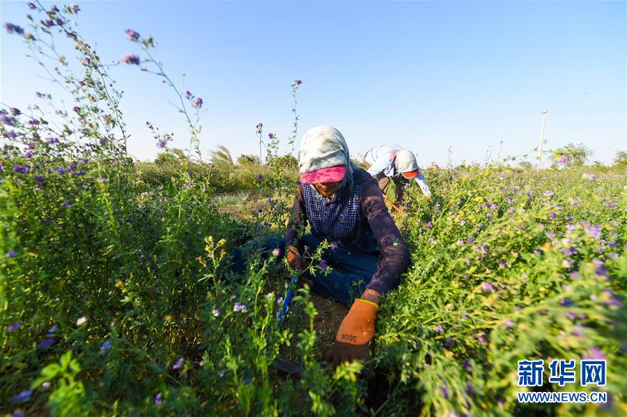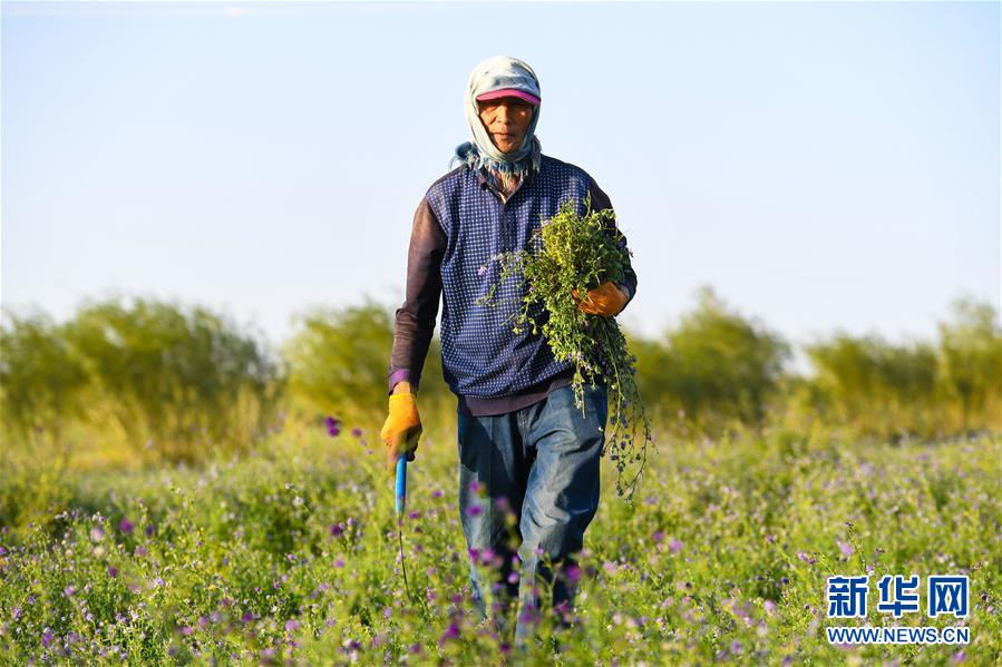 7月7日,孟和巴依尔和老伴胡娜仁在收割苜蓿。 新华社记者 彭源 摄
