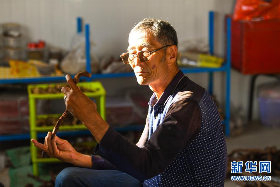 7月7日,孟和巴依尔在仓库中查看苁蓉的风干情况。 新华社记者 彭源 摄