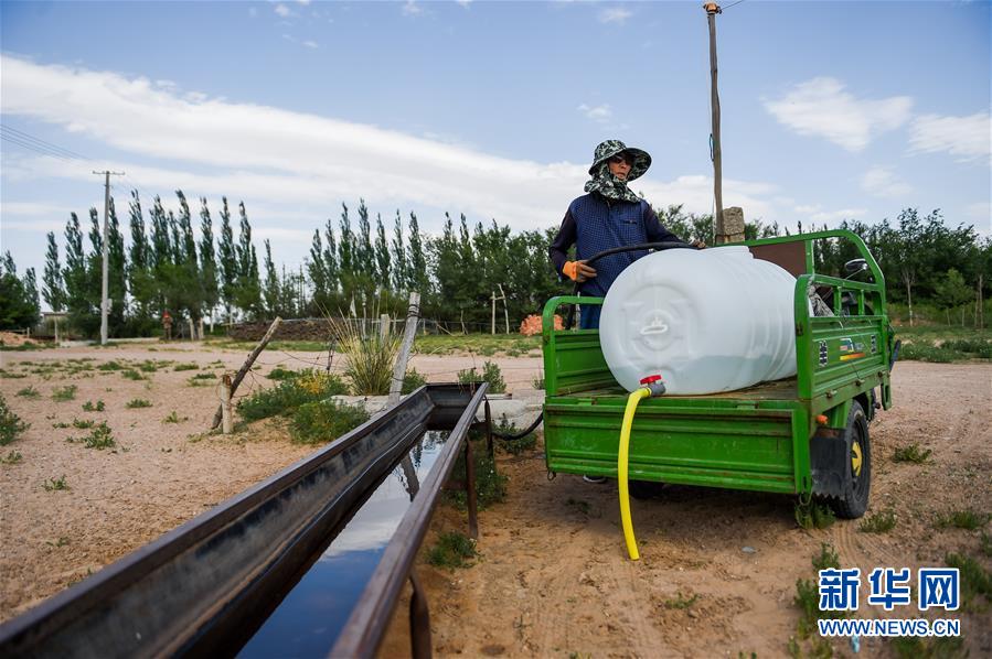 7月7日,孟和巴依尔接水准备去种植锁阳。 新华社记者 连振 摄