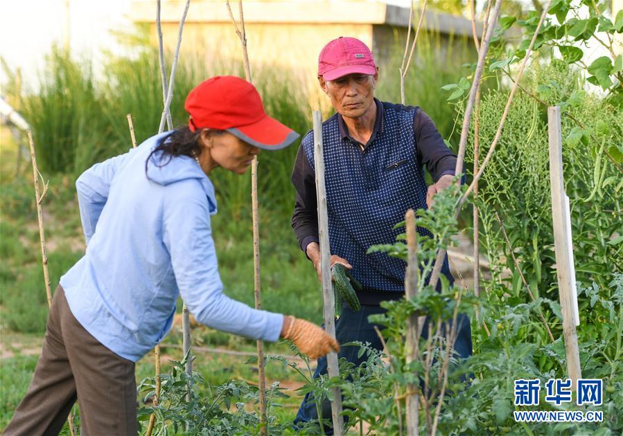 7月7日,孟和巴依尔(右)和老伴胡娜仁在自家的菜园中采摘黄瓜。新华社记者 彭源 摄