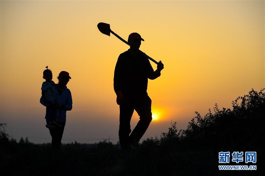 7月7日,孟和巴依尔和老伴胡娜仁结束了一天的忙碌,带着孙子德勒凯在夕阳下回家。 新华社记者 彭源 摄
