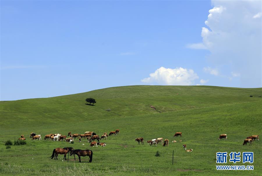 内蒙古兴安盟科尔沁右翼前旗境内的草原景色(7月5日摄)。 夏日,内蒙古广袤的大草原碧草连天,美景如画。 新华社记者 贾立君 摄