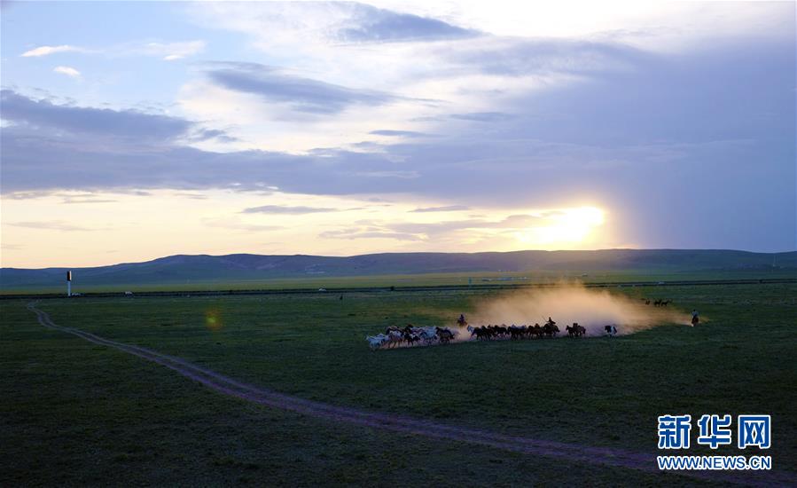 在内蒙古锡林郭勒盟锡林浩特市凤凰马场拍摄的暮归的马群(6月26日摄)。 夏日,内蒙古广袤的大草原碧草连天,美景如画。 新华社记者 贾立君 摄