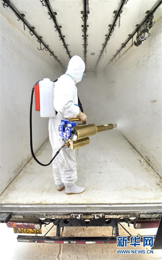 7月15日,北京二商肉类食品集团有限公司员工对冷链运输设备进行消毒。 北京二商肉类食品集团有限公司是保障北京肉类市场供应的主要企业之一。新冠肺炎疫情以来,企业严格实施北京市、农业农村部和中国肉类协会的防疫要求,对进入厂区的人员、车辆以及原料采购、屠宰分割、产品加工、贮藏运输、废弃物收集及污水处理等生产环节严格防疫,强调源头把关彻底消毒。目前,集团公司下属多家生猪屠宰加工基地正常运营,保质保量供应北京市场需求。 新华社记者 李欣 摄