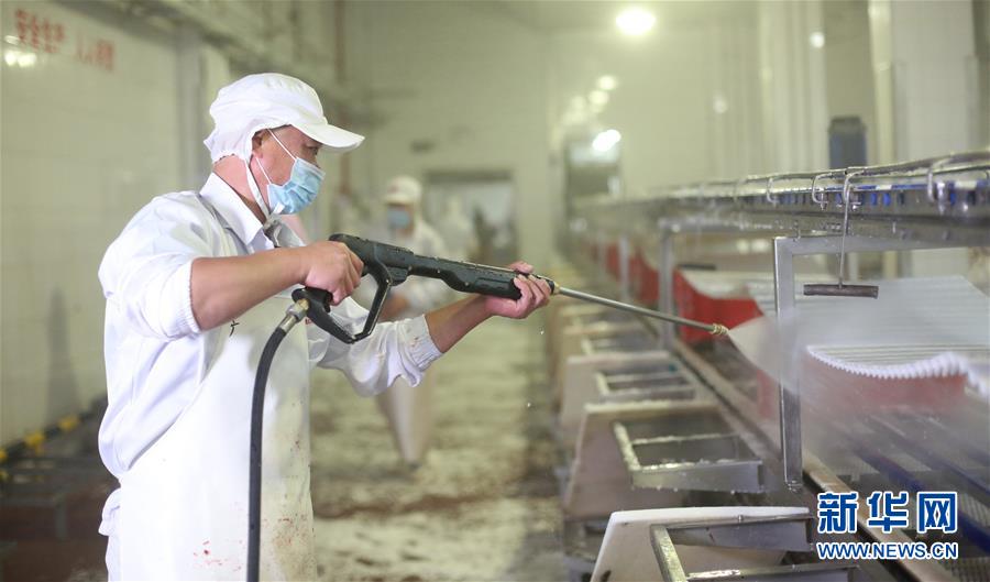 7月14日,北京二商肉类食品集团有限公司员工对肉类分割流水线进行清洗消毒。 北京二商肉类食品集团有限公司是保障北京肉类市场供应的主要企业之一。新冠肺炎疫情以来,企业严格实施北京市、农业农村部和中国肉类协会的防疫要求,对进入厂区的人员、车辆以及原料采购、屠宰分割、产品加工、贮藏运输、废弃物收集及污水处理等生产环节严格防疫,强调源头把关彻底消毒。目前,集团公司下属多家生猪屠宰加工基地正常运营,保质保量供应北京市场需求。 新华社记者 李欣 摄