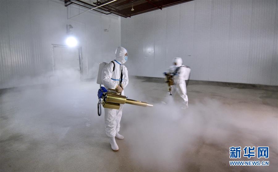 7月14日,北京二商肉类食品集团有限公司员工对肉类冷藏库房进行全方位消毒。 北京二商肉类食品集团有限公司是保障北京肉类市场供应的主要企业之一。新冠肺炎疫情以来,企业严格实施北京市、农业农村部和中国肉类协会的防疫要求,对进入厂区的人员、车辆以及原料采购、屠宰分割、产品加工、贮藏运输、废弃物收集及污水处理等生产环节严格防疫,强调源头把关彻底消毒。目前,集团公司下属多家生猪屠宰加工基地正常运营,保质保量供应北京市场需求。 新华社记者 李欣 摄