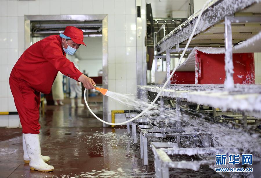 7月14日,北京二商肉类食品集团有限公司员工对肉类分割流水线进行清洗消毒。 北京二商肉类食品集团有限公司是保障北京肉类市场供应的主要企业之一。新冠肺炎疫情以来,企业严格实施北京市、农业农村部和中国肉类协会的防疫要求,对进入厂区的人员、车辆以及原料采购、屠宰分割、产品加工、贮藏运输、废弃物收集及污水处理等生产环节严格防疫,强调源头把关彻底消毒。目前,集团公司下属多家生猪屠宰加工基地正常运营,保质保量供应北京市场需求。 新华社记者 李欣 摄