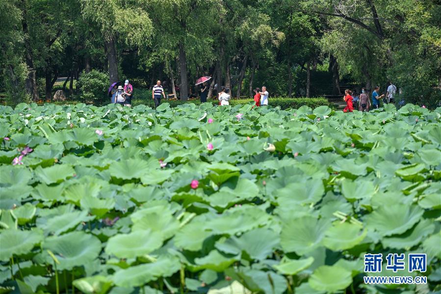 7月16日,人们在长春南湖公园荷花池边游览。 近日,吉林长春南湖公园荷花进入盛花期,吸引众多市民和游客前来观赏。 新华社记者 张楠 摄