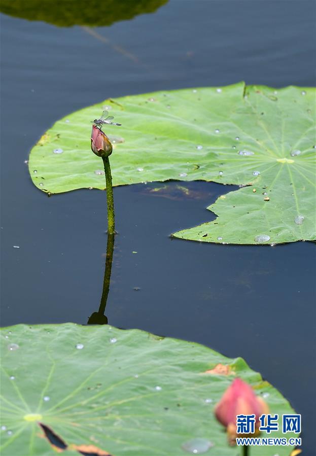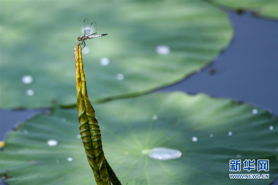 在长春南湖公园,一只蜻蜓在荷花上停歇(7月16日摄)。 近日,吉林长春南湖公园荷花进入盛花期,吸引众多市民和游客前来观赏。 新华社记者 张楠 摄