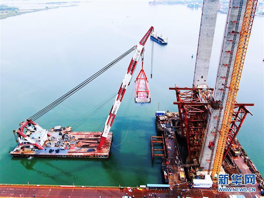 这是5月29日拍摄的广东湛江调顺跨海大桥施工现场(无人机照片)。 新华社记者 卢烨 摄