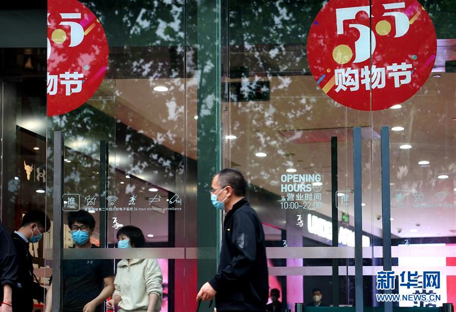 这是上海淮海路一家商场的“五五购物节”标识(5月5日摄)。5月4日晚,上海首次启动大规模商业促销活动“五五购物节”,多家在线新经济企业参与。 新华社记者 刘颖 摄 主要指标恢复性增长,经济大盘依然稳固有韧性—— 上半年,经济先降后升,6月全国城镇调查失业率为5.7%,连续两个月小幅下降;居民消费价格涨势温和,上半年3.8%的涨幅比一季度回落1.1个百分点;外汇储备超过3.1万亿美元,国际收支平稳。 内需持续回暖,生产加快复苏,新兴动能增强—— 二季度,社会消费品零售总额降幅比一季度收窄15.1个百分点,“618”大促多平台网络购物累计成交超万亿元;制造业PMI连续4个月站上荣枯线;低风险地区电影院将于7月20日有序恢复营业;居家办公、在线教育等新业态快速扩张……
