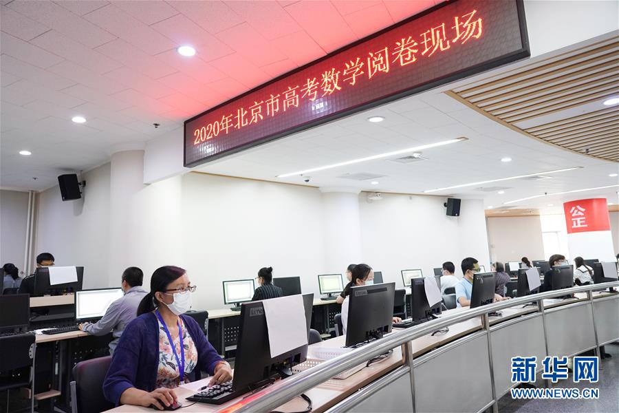 7月16日,评卷老师在位于清华大学的高考数学阅卷现场用计算机系统阅卷。 当日,北京市举行2020年高考评卷工作媒体开放日。据介绍,北京市2020年高考评卷工作已于7月9日开始,预计24日结束。北京市共组织1290名教师,在北京大学、清华大学等六个评卷点对近35万份答卷进行评阅。考试成绩将于7月25日12时发布。 新华社记者 鞠焕宗 摄
