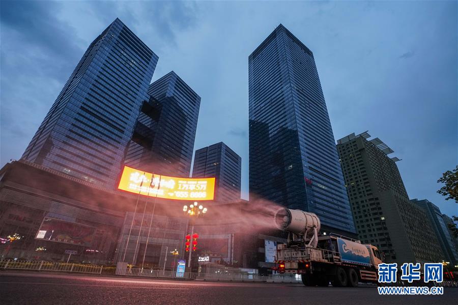 7月20日,乌鲁木齐市天山区城管局清运队的工作车辆在市区光明路进行消杀作业。 乌鲁木齐市天山区城管局自7月17日起,对天山区的主次干道76条及235条巷道进行集中消杀。目前,乌鲁木齐市对重点区域进行全面消毒消杀。 新华社记者 赵戈 摄