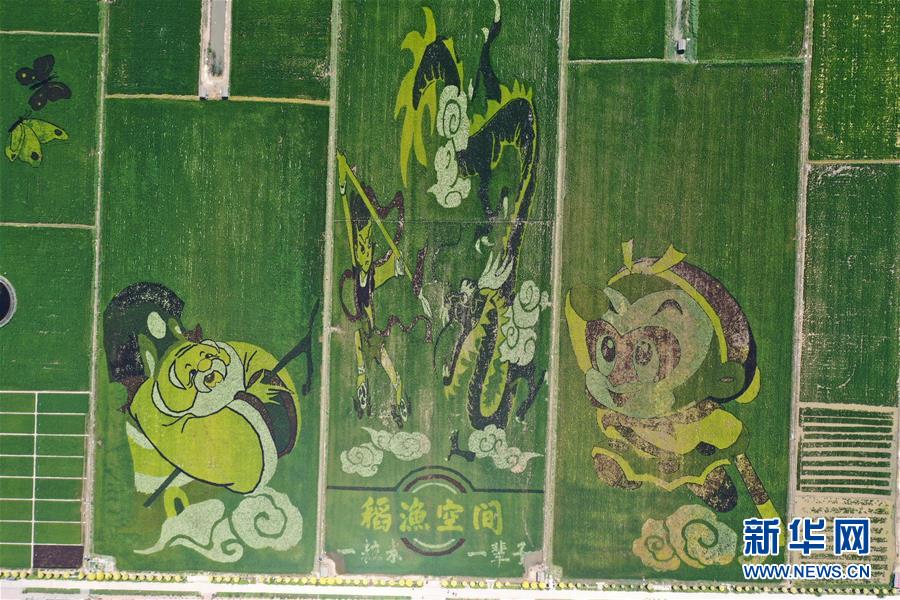 这是宁夏贺兰县稻渔空间乡村生态观光园内的稻田画(7月22日摄,无人机照片)。 近日,宁夏银川市贺兰县的稻渔空间乡村生态观光园的稻田画进入最佳观赏期,园内题材多样的稻田画成为一道别致的乡村景观。 新华社记者 刘海 摄