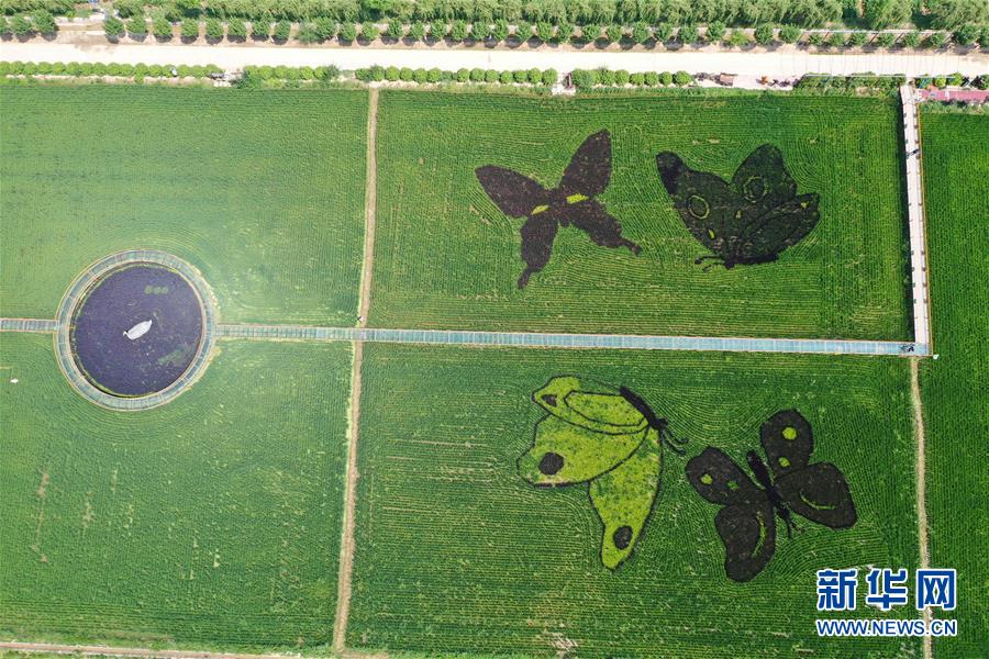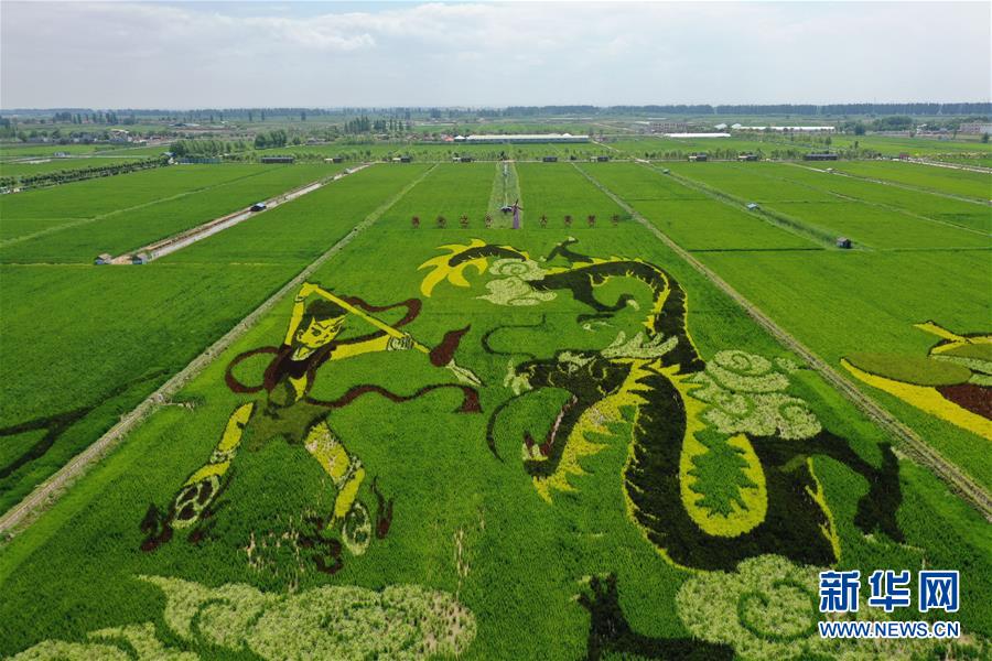 这是宁夏贺兰县稻渔空间乡村生态观光园内的稻田画(7月22日摄,无人机照片)。 近日,宁夏银川市贺兰县的稻渔空间乡村生态观光园的稻田画进入最佳观赏期,园内题材多样的稻田画成为一道别致的乡村景观。 新华社记者 刘海 摄