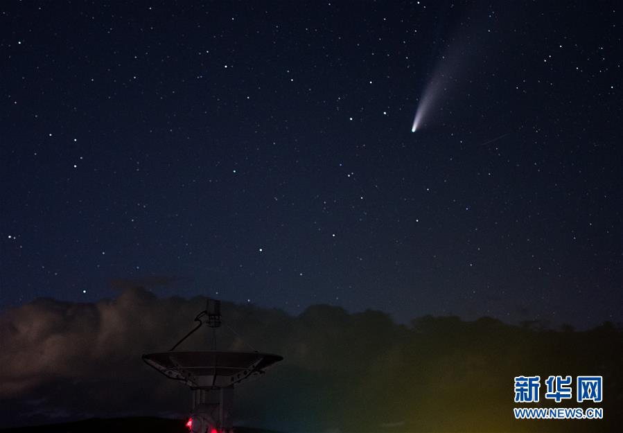 7月18日晚,在明安图观测基地,尼欧怀兹彗星划过天际。 7月18日晚至19日凌晨,在位于内蒙古锡林郭勒盟正镶白旗境内的国家天文台明安图观测基地,尼欧怀兹彗星划过天际。在明安图观测基地内,排列着100面白色的抛物面天线。这个庞大的天线阵列便是草原“天眼”——明安图射电频谱日像仪。草原“天眼”持续接收太阳射电辐射,然后由科研人员进行数据分析研究,对空间环境监测、太阳活动预报均有重要作用。 新华社记者 连振 摄