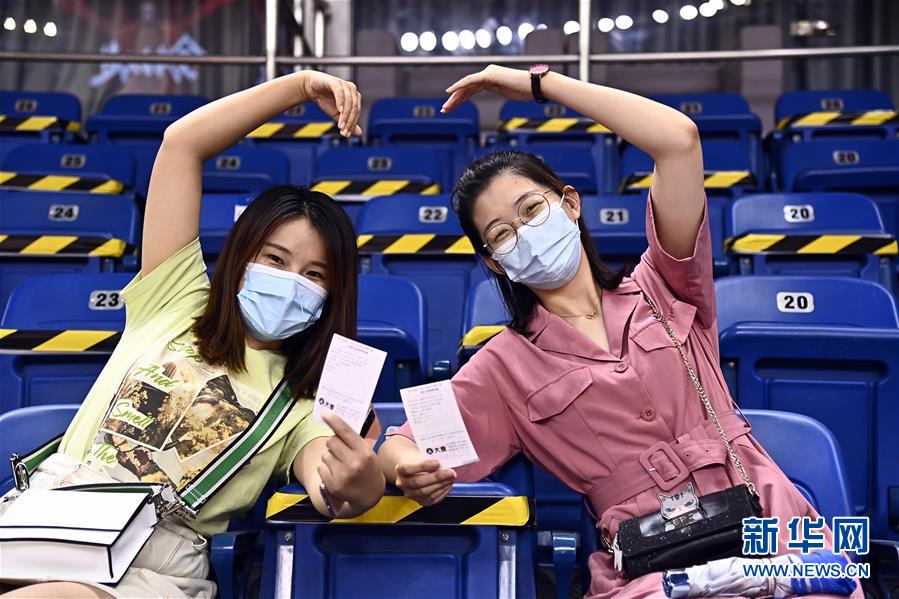 7月26日,在青岛国信体育馆,两位现场观看比赛的观众展示着自己的纸质球票。 当日,在山东青岛举行的2019-2020赛季中国男子篮球职业联赛(CBA)复赛第二阶段(崂山赛区)比赛中,医护人员、教师、公安战线人士通过官方购票平台,完成包括核酸检测在内的相关流程后进场观看了上海久事队迎战山东西王队的比赛。 观赛期间,观赛者须全程佩戴口罩,对号入座,严格保持间隔一米就座。退场时,观众须按照自后向前、先两边后中间的顺序,保持“一米线”社交距离有序退场。 新华社记者 郭绪雷 摄