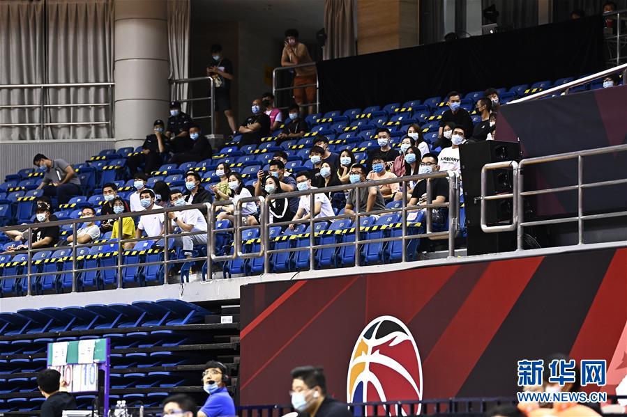 7月26日,观众观看上海久事队与山东西王队的比赛。该场比赛首次恢复观众现场观看比赛。 当日,在山东青岛举行的2019-2020赛季中国男子篮球职业联赛(CBA)复赛第二阶段(崂山赛区)比赛中,医护人员、教师、公安战线人士通过官方购票平台,完成包括核酸检测在内的相关流程后进场观看了上海久事队迎战山东西王队的比赛。 观赛期间,观赛者须全程佩戴口罩,对号入座,严格保持间隔一米就座。退场时,观众须按照自后向前、先两边后中间的顺序,保持“一米线”社交距离有序退场。 新华社记者 郭绪雷 摄