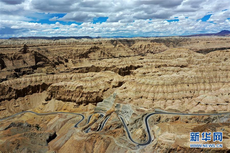 这是7月26日在西藏阿里地区札达县托林镇拍摄的札达土林(无人机照片)。 札达土林位于西藏阿里地区札达县境内,千姿百态的土林与蓝天、白云相互映衬,景色壮美。 新华社记者 詹彦 摄