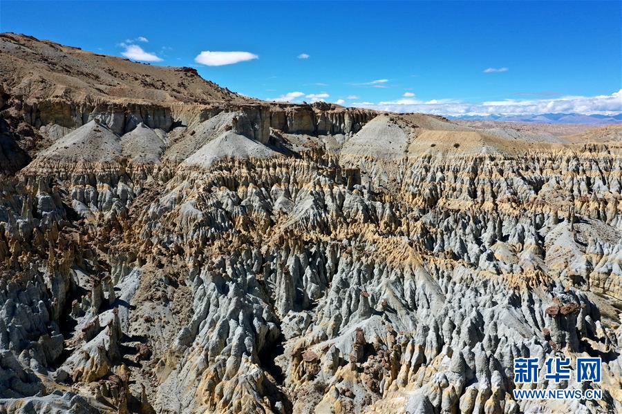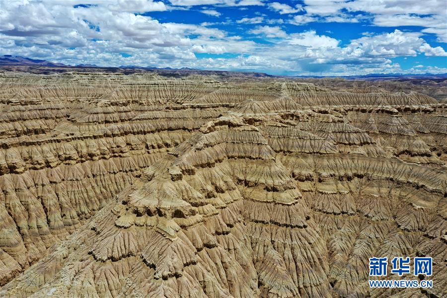这是7月26日在西藏阿里地区札达县托林镇拍摄的札达土林(无人机照片)。 札达土林位于西藏阿里地区札达县境内,千姿百态的土林与蓝天、白云相互映衬,景色壮美。 新华社记者 詹彦 摄