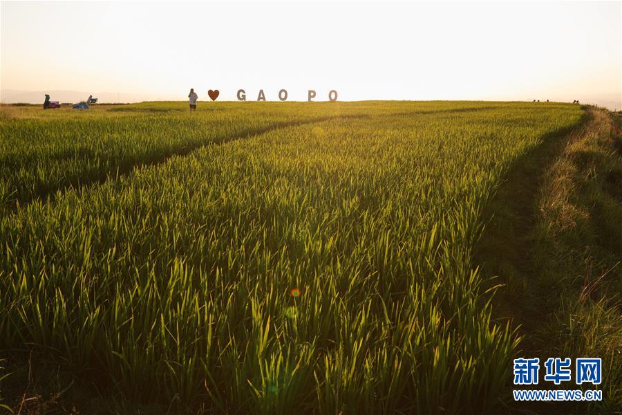游客在高坡乡一处稻田中游玩(7月27日摄)。 夏日时节,贵州省贵阳市花溪区高坡乡境内层峦叠嶂、满目翠绿,独特的高原景观吸引不少游客前来观光旅游。 新华社记者 刘续 摄