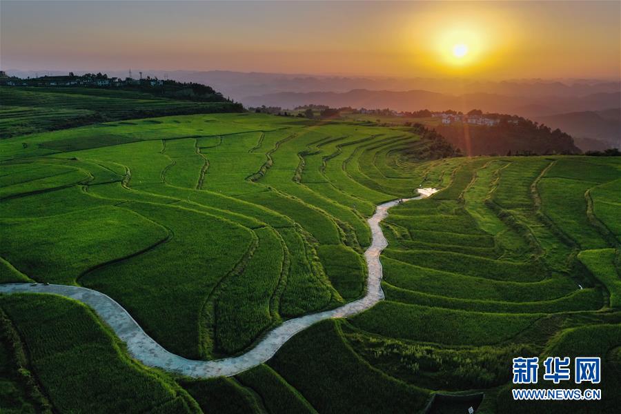 夕阳下高坡乡的稻田(7月27日摄,无人机照片)。 夏日时节,贵州省贵阳市花溪区高坡乡境内层峦叠嶂、满目翠绿,独特的高原景观吸引不少游客前来观光旅游。 新华社记者 刘续 摄