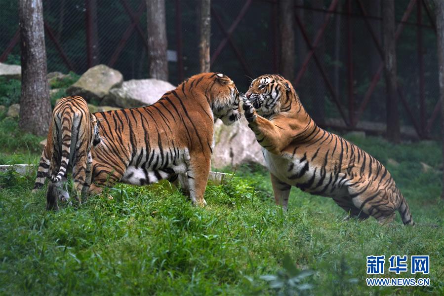 7月29日,在横道河子东北虎林园散放区,东北虎在打闹。新华社记者 王建威 摄