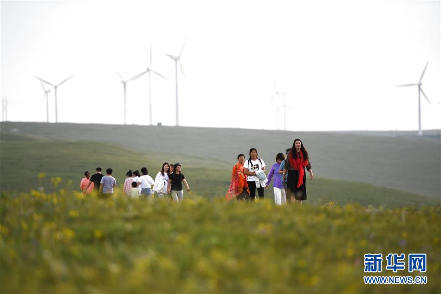 7月30日,游客在辉腾锡勒(黄花沟)草原旅游区游玩。新华社记者 刘磊 摄