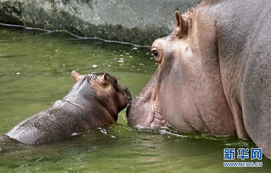 北京动物园的河马母子在恒温水池内乘凉(7月30日摄)。 炎炎夏日,北京动物园根据动物生活习性,为动物配备了自动喷淋喷雾、空调笼舍、恒温水池、遮阳棚等各类避暑设施,同时还准备了西瓜等降温食品,保障动物平安舒适地度过伏天。 新华社记者李欣摄