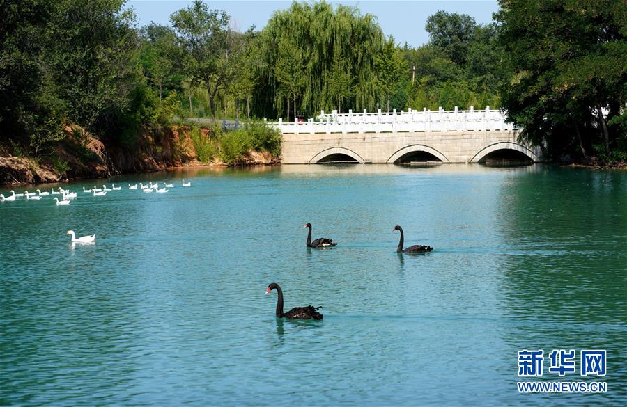 这是7月26日在栾卸村湖区拍摄到的天鹅。 盛夏,位于太行山区的河北省沙河市栾卸村满目葱茏,山水、田园、民居构成一幅美丽乡村图景。 新华社记者 牟宇 摄